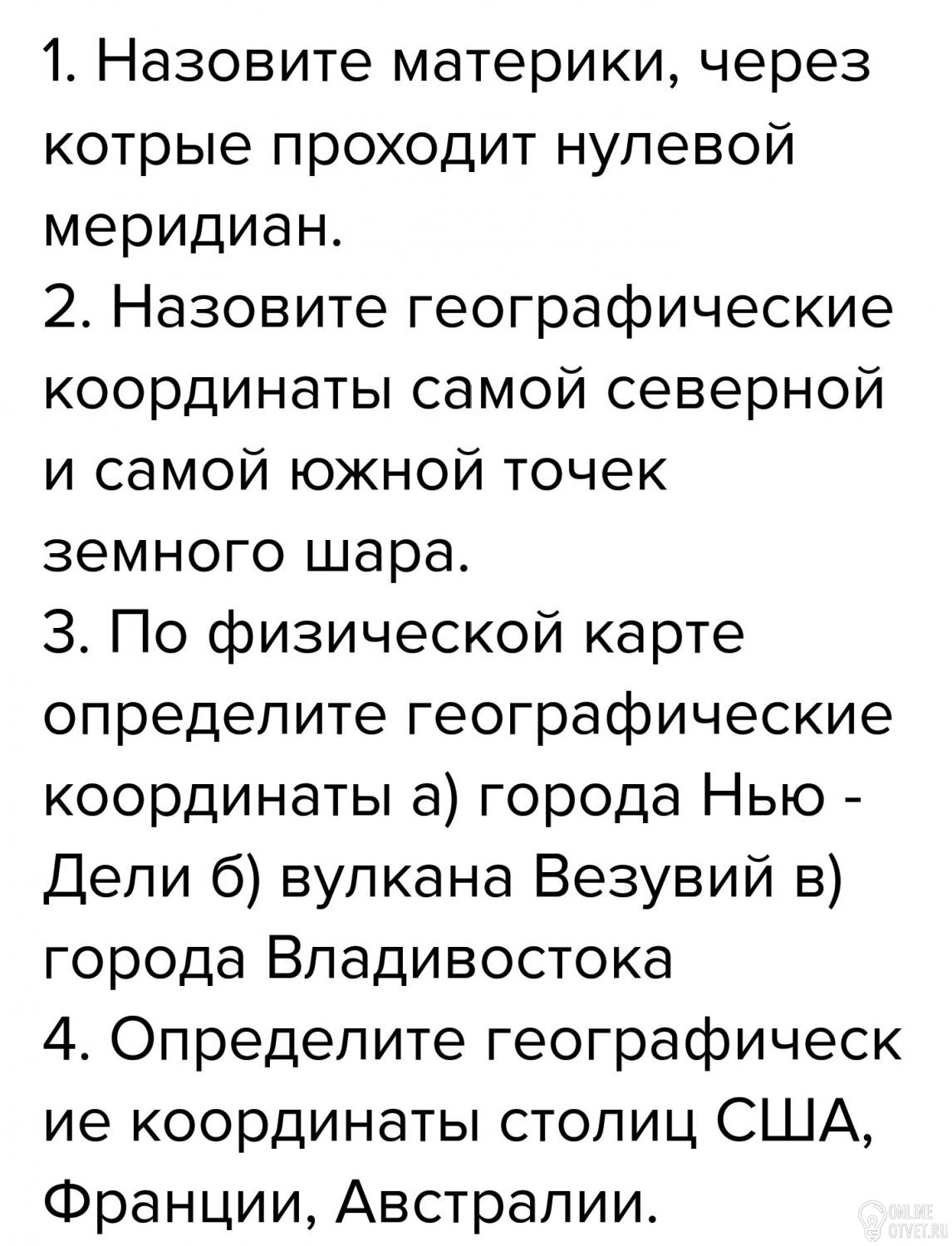 3)Нью-Дели (28 с. ш. ; 77 в. д.) вулкан Везувий( 40 с. ш. ; 14 в. д.) Владивосток (43 с. ш. ; 131 в. д.)