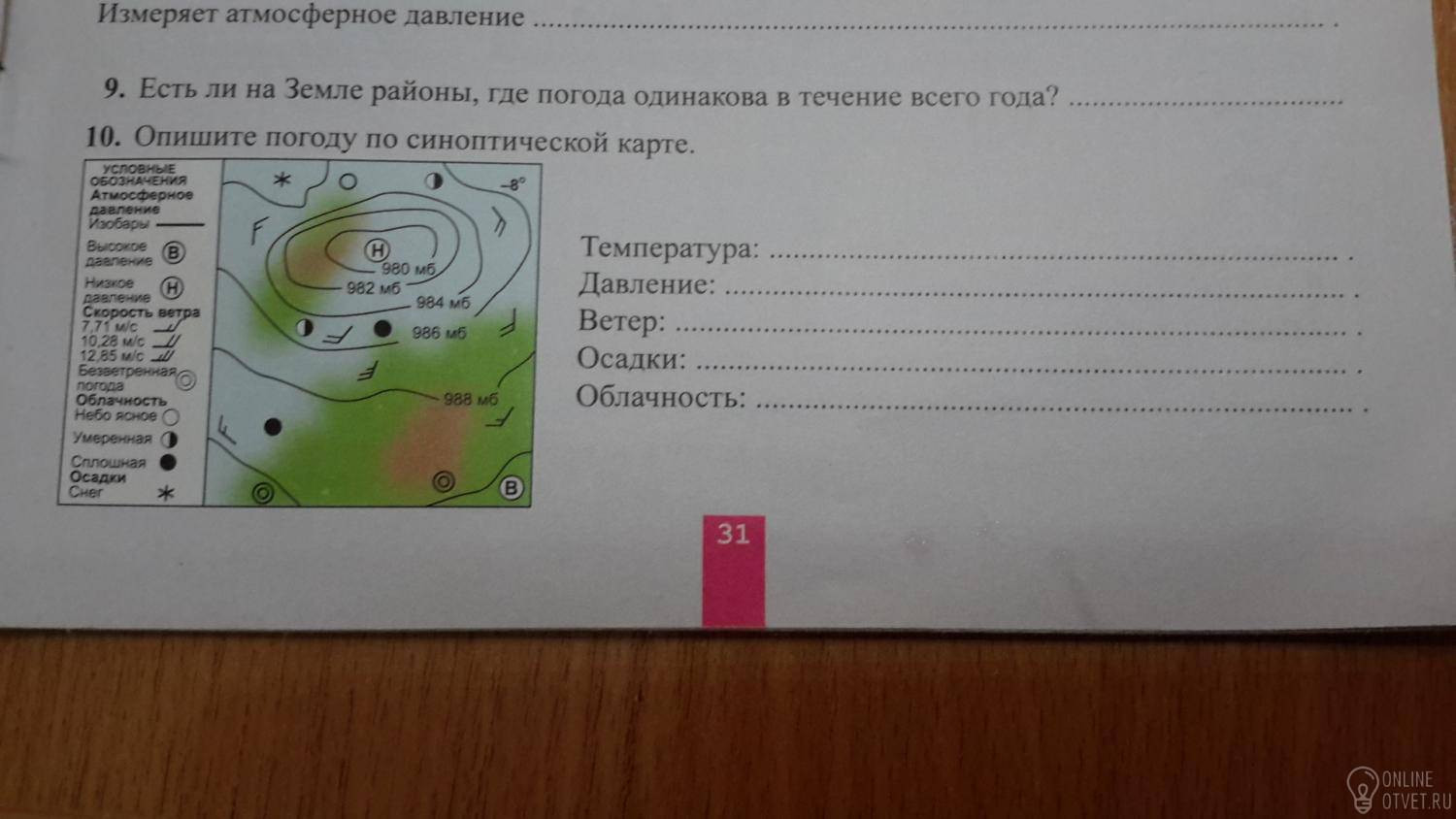 Давление перед теплым фронтом низкое, в центре циклона оно составляет 980 гектапаскалей, что является низким давлением (нормально 1013 ГПа).