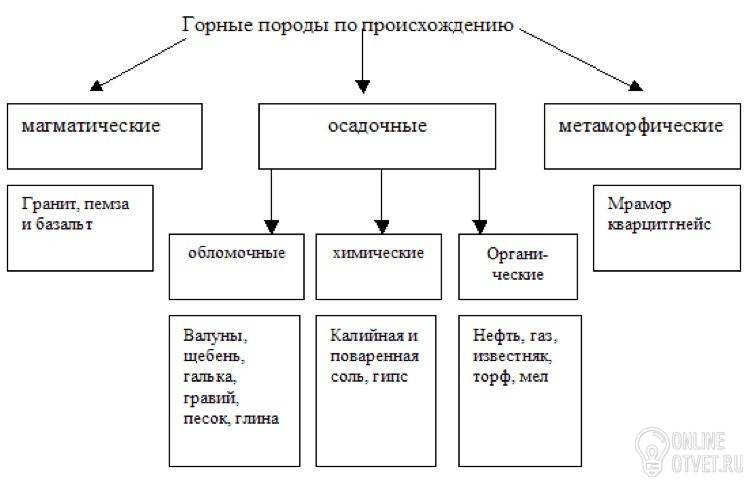 Нарисуйте схему группы горных пород по происхождению Приведите по два примера горных пород каждой группы