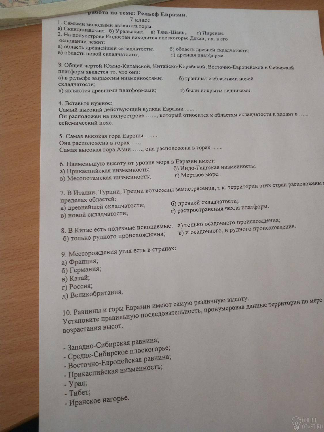 10) Прикаспийская низменность Западно-Сибирская равнина, Восточно-Европейская равнина, Средне-Сибирское плоскогорье, Уральские горы, Иранское нагорье, Тибет