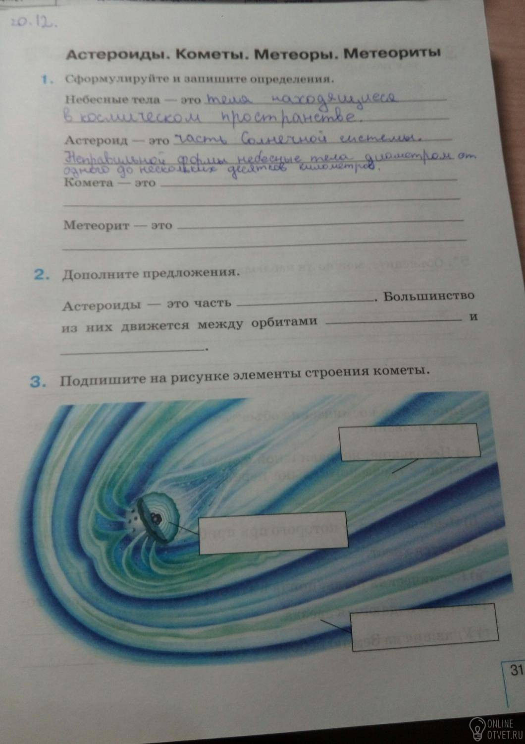 Комета — небольшое небесное тело, обращающееся вокруг Солнца по весьма вытянутой орбите в виде конического сечения. При приближении к Солнцу комета образует кому и иногда хвост из газа и пыли.