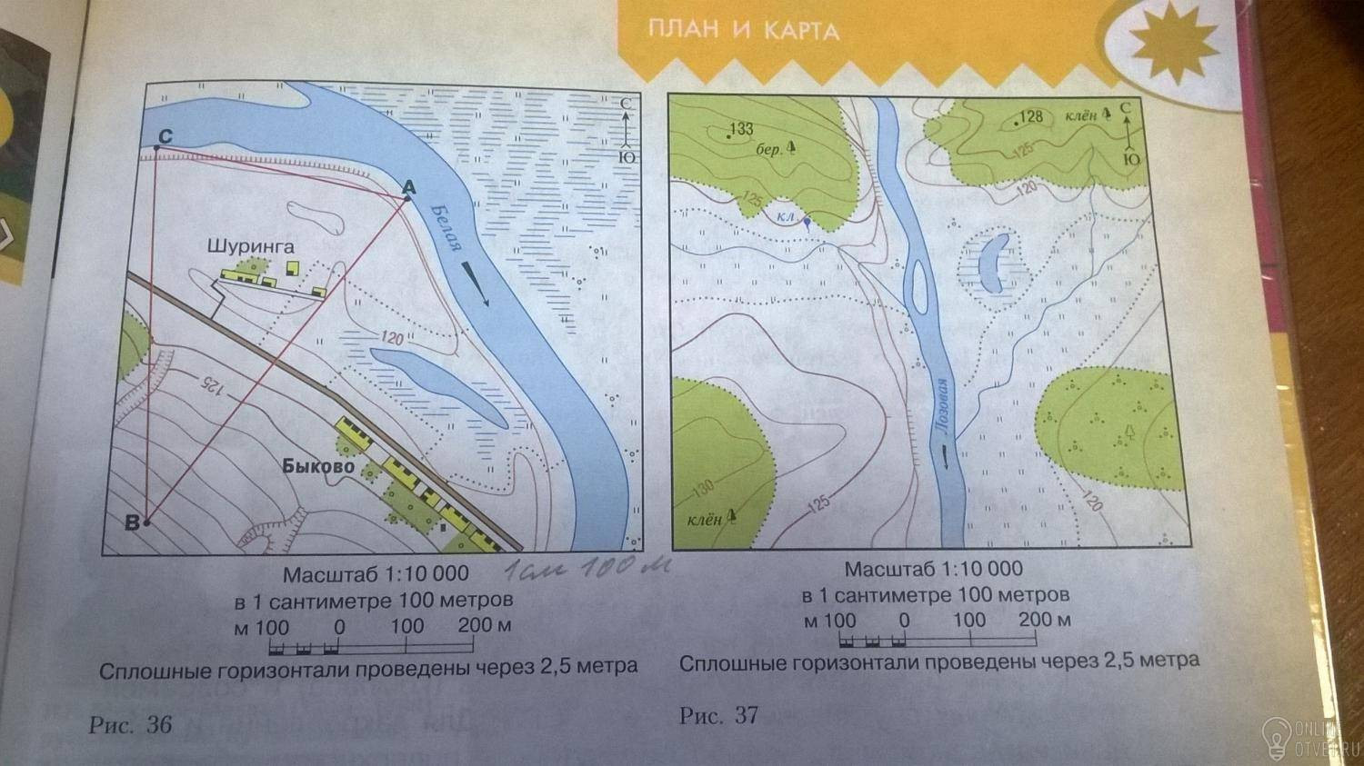 Изучите топографическую карту на рисунке 36. С помощью масштаба определите расстояние по прямой: а) от точки В до точки А; б) от точки В до точки С.