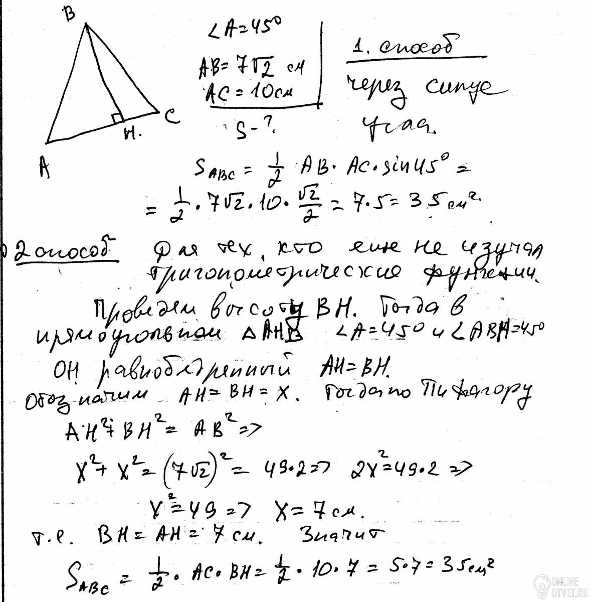 Две стороны треугольника равны 7квадратный корень из 2 см и 10 см,а угол между ними равен 45 градусов.Найдите площадь треугольника