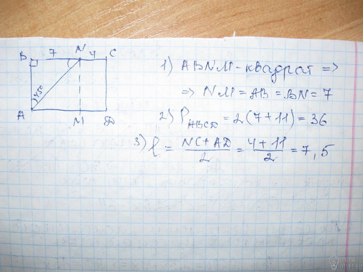 В прямоугольнике ABCD биссектриса AN угла BAD делит сторону BC на отрезки: BN=7 см и NC=4 см. Найдите: 1) периметр прямоугольника; 2) длину средней линии трапеции ANCD.