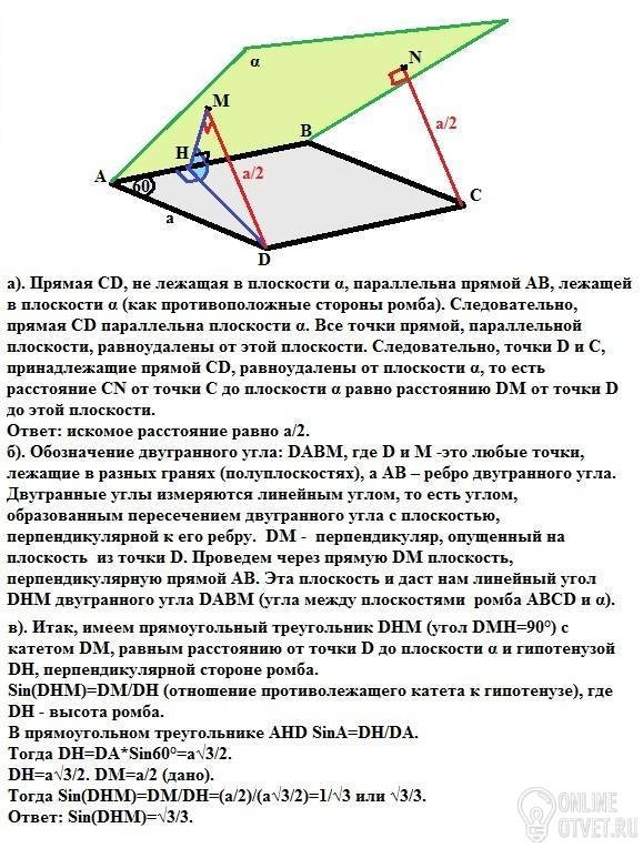 в)Найдите синус угла между плоскостью ромба и плоскостью альфа.