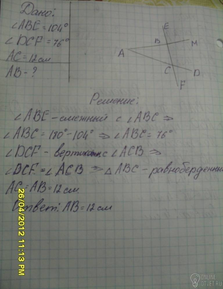 Угол ABE=104 градуса,угол DCF=76градусов,AC=12см.найдите сторону AB треугольника ABC
