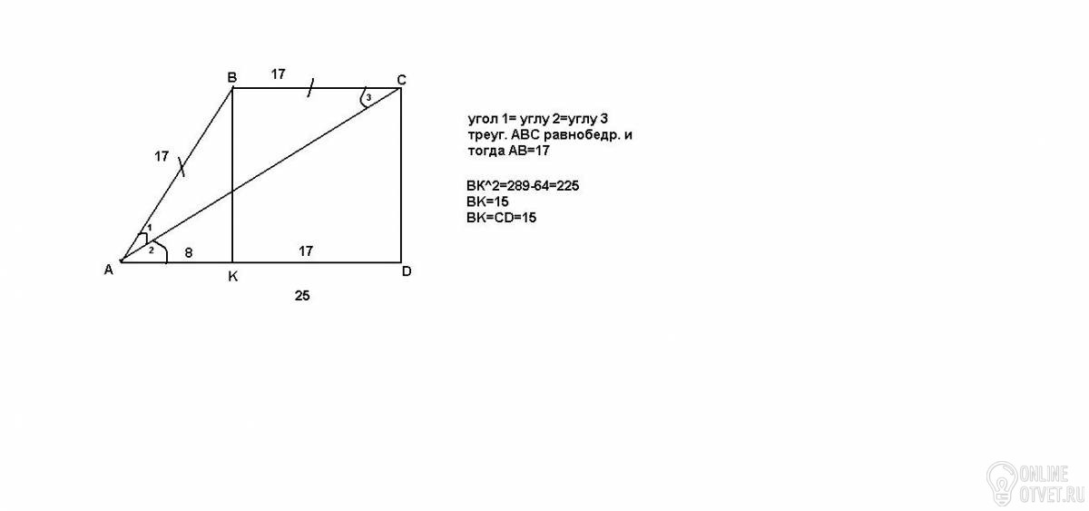 в прямоугольной трапеции ABCD с основанием 17 см и 25 см диагональ AC является биссектрисой острого угла .Найдите меньшую боковую сторону трапеции