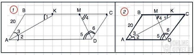 BК=АВ, МC=CD, а так как противоположные стороны параллелограмма равны. , а ВС делится на три равных отрезка, то BК=CM=КМ=CD=АВ=20 см