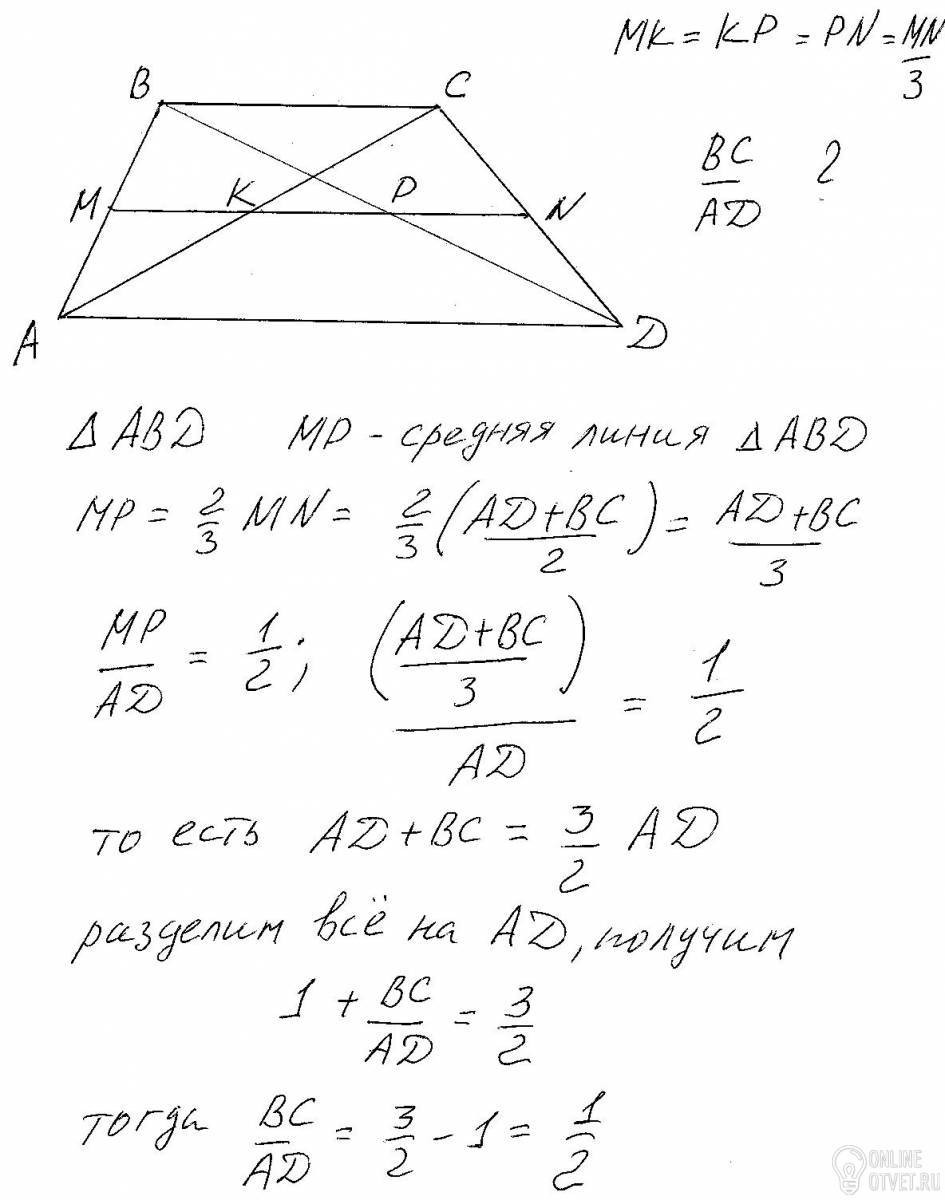 Знайдіть відношення основ трапеції, якщо її діагоналі поділяють середню лінію трапеції на 3 рівні частини.