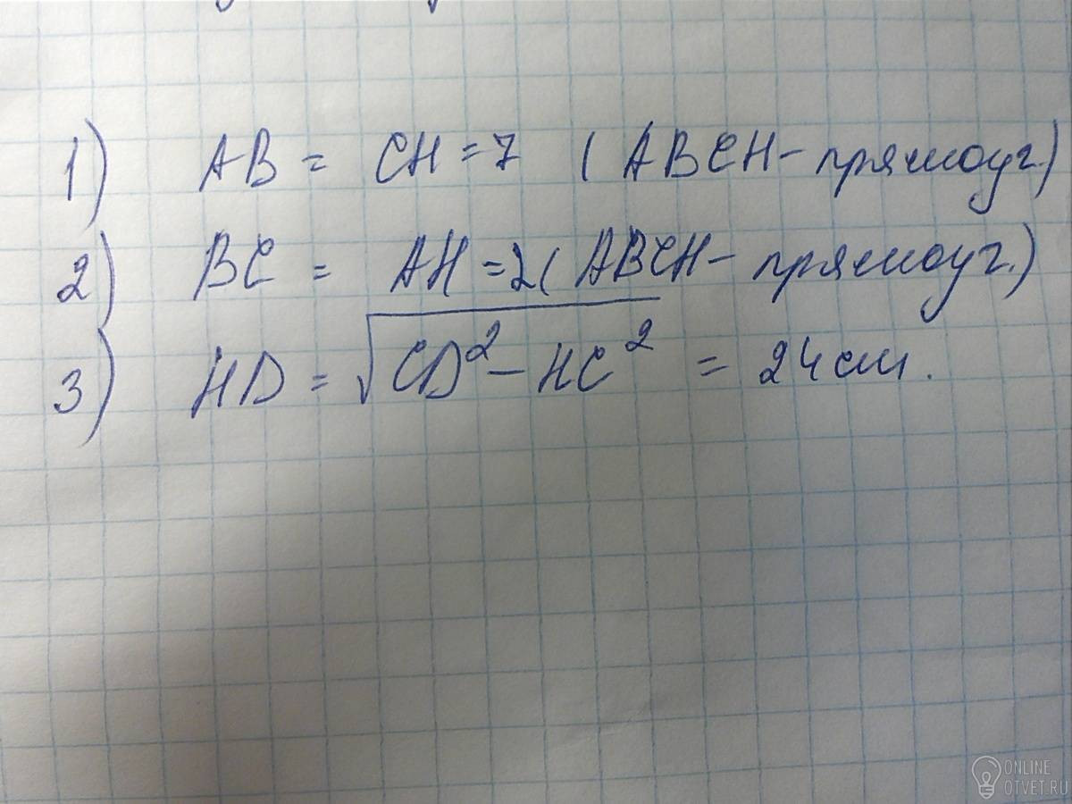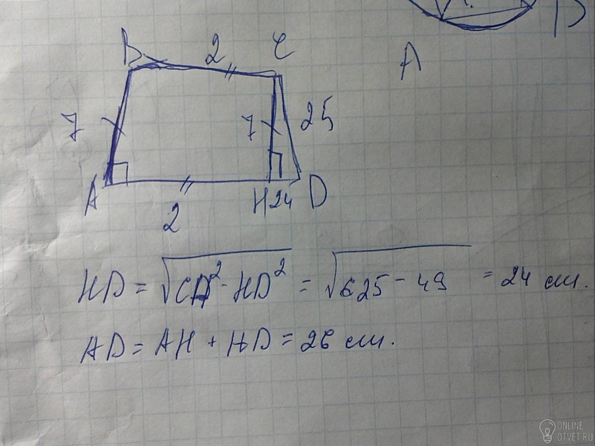В прямоугольной трапеции боковые стороны равны 7 см и 25 см, а меньшее основание равно 2 см.Найдите большее основание