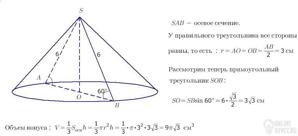 осеое сечение конуса правильный треугольник со стороной 6 см.Найдите объём конуса . помогите решить пожалуйста