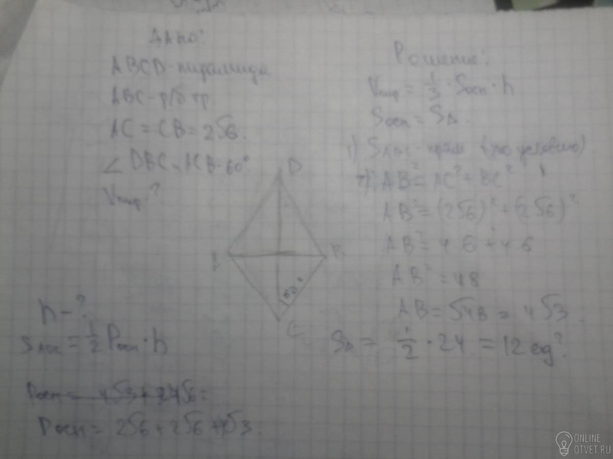 Основание пирамиды равнобедренный прямоугольный треугольник с катетами 2корень из 6. Боковые ребра наклонены к площади основания под углом 60 градусов. Найти объем пирамиды.