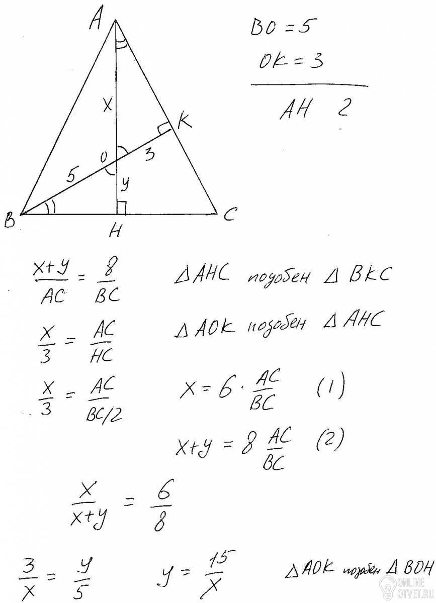 Высоты AH и BK равнобедренного треугольника ABC с основанием BC пересекаются в точке O так, что BO=5, OK=3. Нaйдите AH