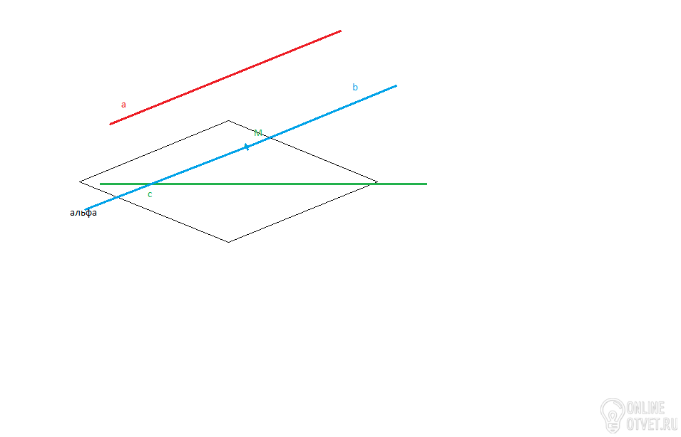 Прямая b, параллельна прямой (а) -общая точка М с плоскостью Альфа -прямая b лежит в Альфа.