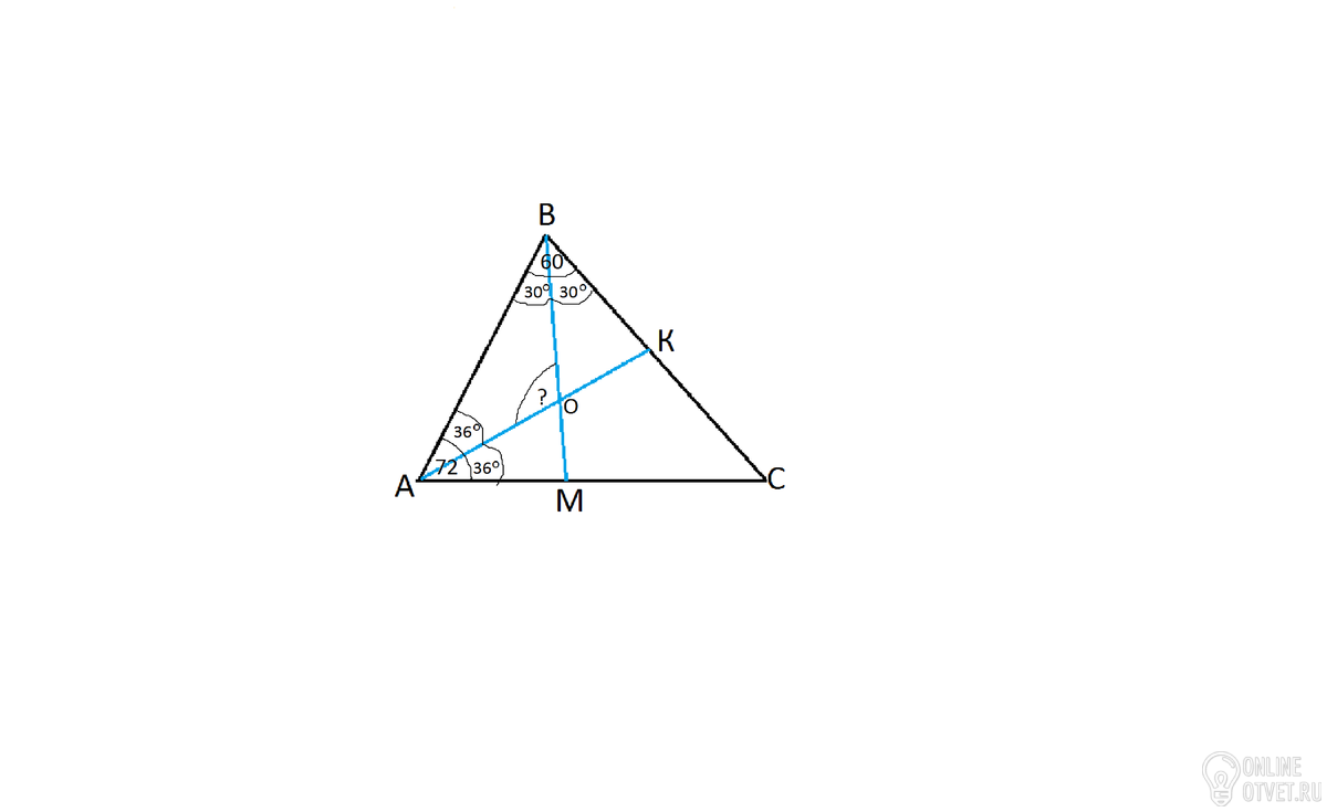 Биссектрисы AK и BM треугольника ABC пересекаются в точке О угол А=72 град угол B =60 град найти угол AOB