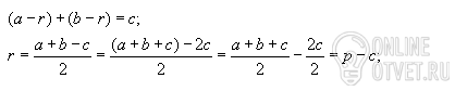 докажите.что радиус окружности ,вписанной в прямоугольный треугольник ,равен разности полупериметра треугольника и гипотенузы .