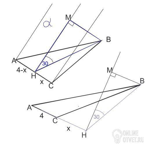 Длины сторон треугольника АВС соответственно равны:ВС=15см,АВ=13см,АС=4см.Через сторону АС проведена плоскость а,составляющая с плоскостью данного треугольника угол 30 градусов.Найти расстояние от точки В до плоскости а.