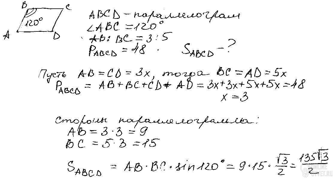 Стороны параллелограмма относятся как 3:5. Найдите площадь параллелограмма, если его периметр равен 48, а один из углов раввен 120 гр.