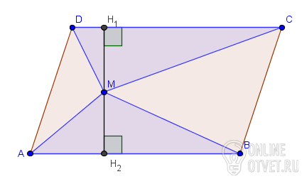 Доказательство очевидно - площадь параллелограмма = AB*(MH1+MH2), сумма площадей двух треугольников = 0.5AB*MH2+0.5BC*MH1=0.5(AB*MH1+AB*MH2)=0.5AB(MH1+MH2)