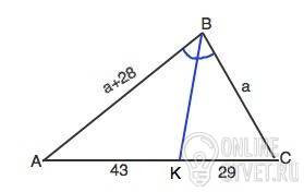 Найдите две стороны треугольника если их разность равна 28 см а биссектриса проведенная к третьей стороне делит ее на отрезки 43 см и 29 см
