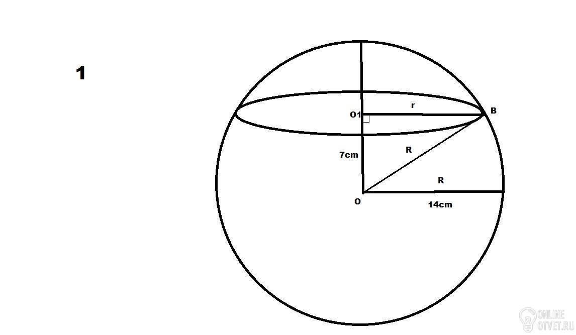 1) Радиус шара равен 14 см. Через середину радиуса , перпендикулярно ему проведена плоскость. Найдите площадь сечения?