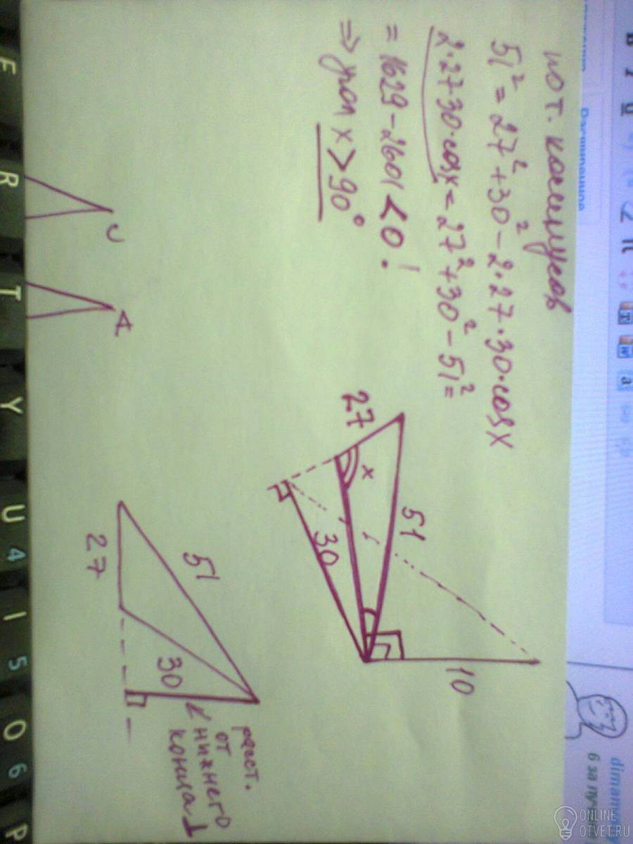 ПОМОГИТЕ ПОЖАЛУЙСТА,НУЖЕН ТОЛЬКО ЧЕРТЕЖ!!!!!!! Стороны треугольника составляют 51,30 и 27.Из вершины меньшего угла треугольника проведён к его плоскости перпендикуляр длиной 10. Вычислите рсстояние от концов перпендикуляра до противоположной стороны треугольника.