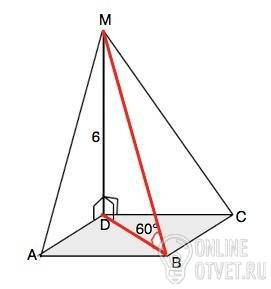 Из точки М проведен перпендикуляр MD, равный 6 см, к плоскости квадрата ABCD.Наклонная MB образует с плоскостью квадрата угол 60градусов.