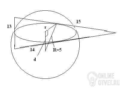 стороны треугольника равны 13 см, 14 см и 15см. шар радиуса 5см касается всех сторон треугольника. найдите расстояние от плоскости треугольника до центра шара.