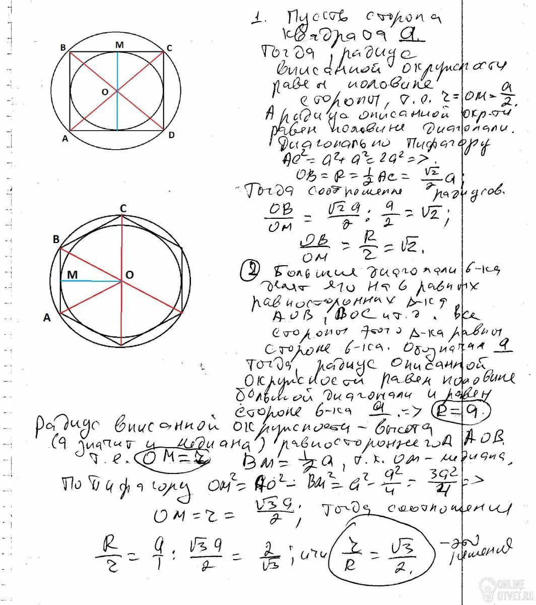 Отношение радиуса описанной к радиусу вписанной в квадрат окружности равно: