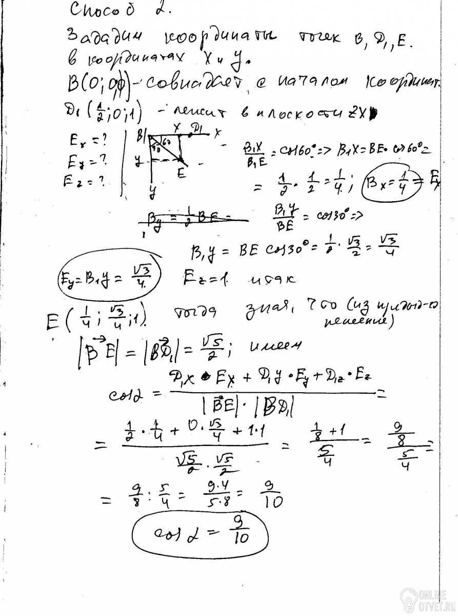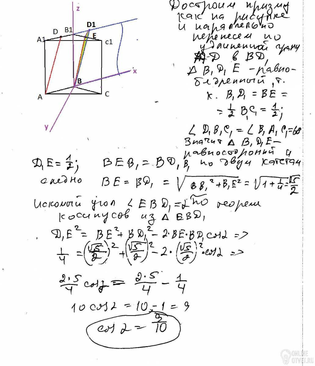 В правильной треугольной призме A...C1,все ребра которой равны 1,точки D,E-середины ребер соответственно A1B1 и B1C1.Найдите косинус угла между прямыми AD и BE.
