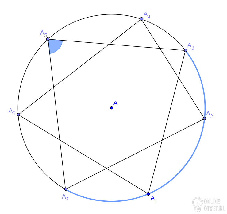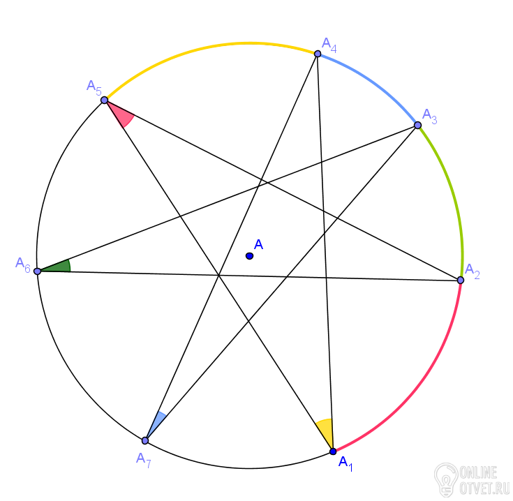 а)На окружности отмечены 7 точек:А1,А2,А3,А4,А5,А6,А7.Точки соединяются друг с другом через две (А1 с А4,А4 с А7,А7 с А3 и т.д.)Найти сумму всех семи вписанных углов А1,А2,А3,А4,А5,А6,А7.