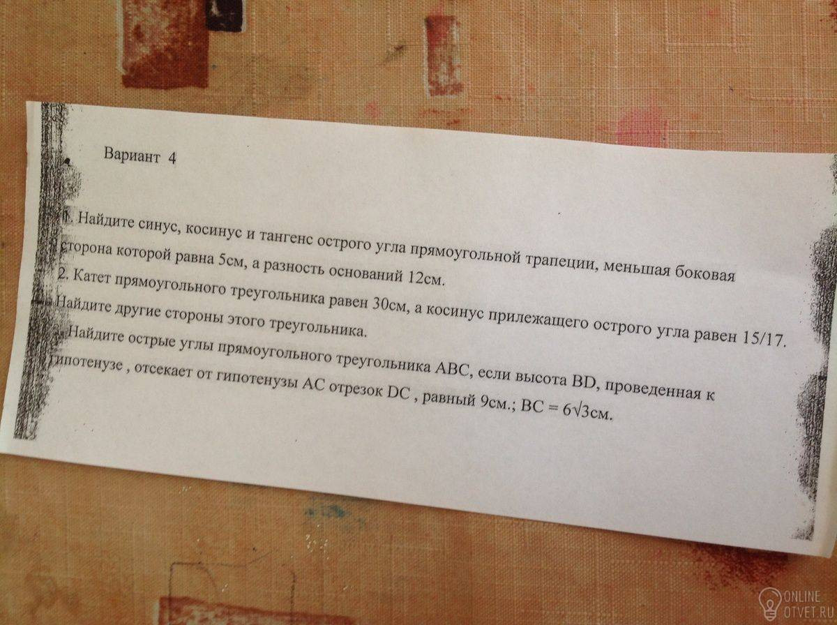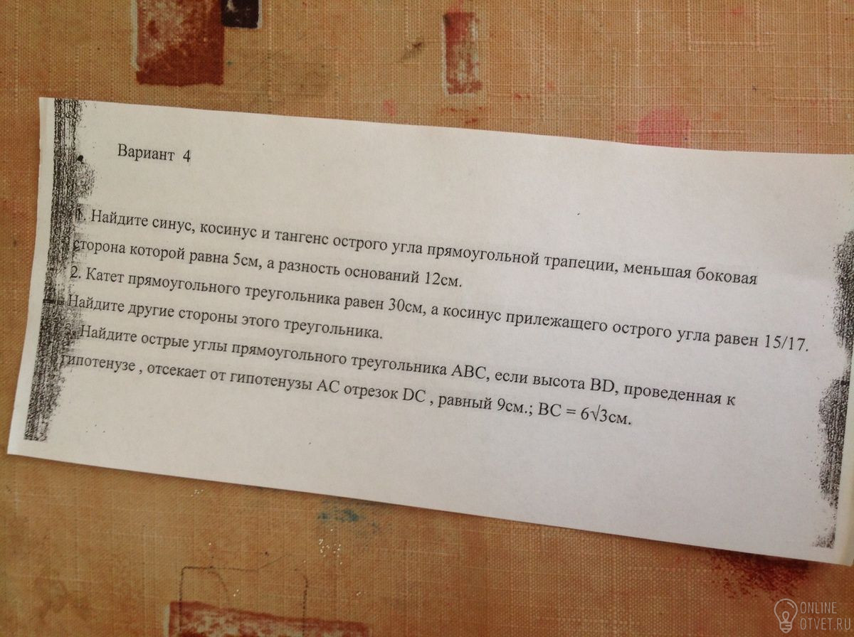 1)проведём в трапеции высоту, она разделила трапецию на прямоугольник и прямоугольный треугольник, у которого один катет равен меньшей стороне трапеции, т.е. =5 см, а второй катет равен разности между основаниями, т.е. = 12. Из прямоугольного треугольника: гипотенуза равна