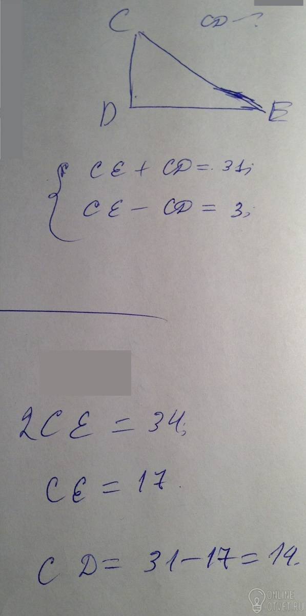 сумма гипотенузы СЕ и катета СД прямоугольного треугольника СДе равна 31см,а ихразность равна 3см. найдите расстояние от вершины С до прямойДЕ