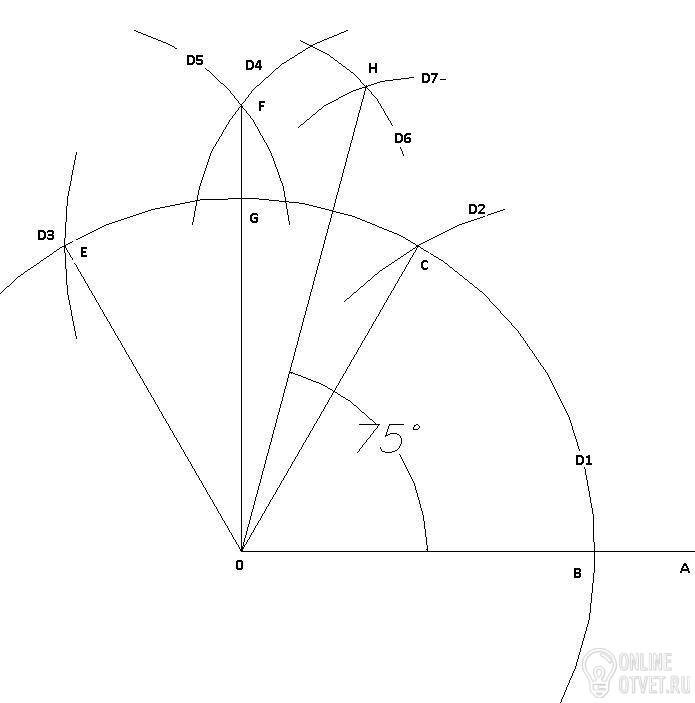 Как начертить угол в 75 градусов с помощью циркуля и линейки без делений???