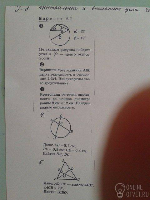 Соединим точку на окружности при угле Х с концом диаметра проходящего через точку О (смотри свой рисунок) Тогда имеем вписанный четырехугольник в котором угол, равный сумме α+β = 21° +49° = 70°. Противоположный ему угол равен 90°+ Х° (90° - так как этот угол опирается на диаметр) Тогда угол 90+Х+70=180, отсюда