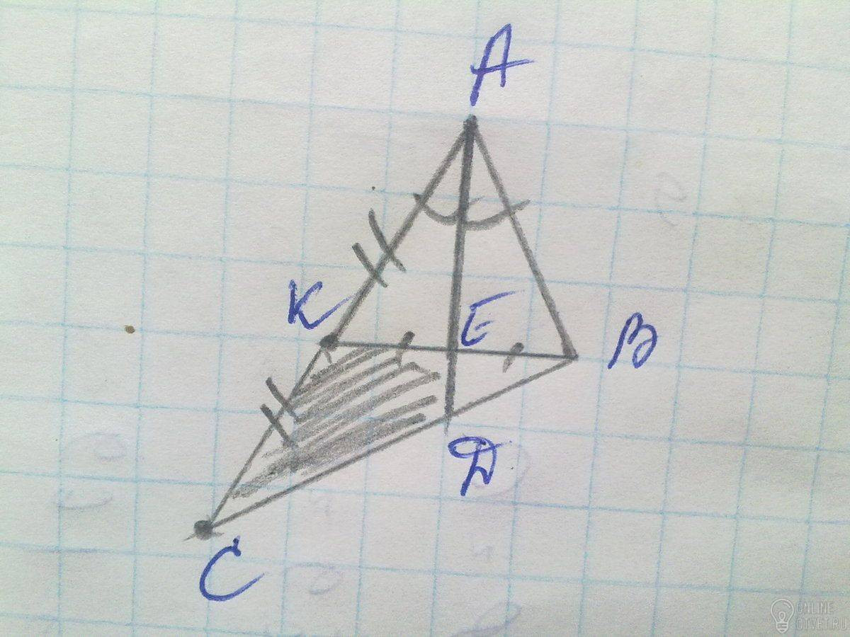 В треугольнике АКВ биссектриса АЕ является еще и медианой, а это значит , что треугольник АКВ равнобедренный и АЕ является также высотой. Отсюда следует, что треугольники АВЕ и АКЕ прямоугольные и равны по двум катетам(КЕ=ЕВ по условию, АЕ-общий), значит АК=АВ и площади этих треугольников равны.