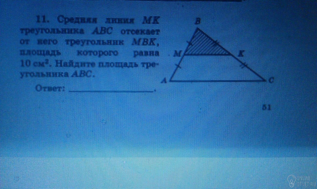 средняя линия делит сторону пополам. Значит наши треугольники подобны с коэффициентом подобия 1/2. Отношение площадей равно коэф. подобия в квадрате, т.е. 1/4. Площадь тр-ка АВС=4*10=40см