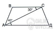 Найдите угол АДС равнобедренной трапеции АВСД если диагональ АС образует с основанием ВС и боковой стороной АВ углы равные 30 и 40 градусов соответственно.