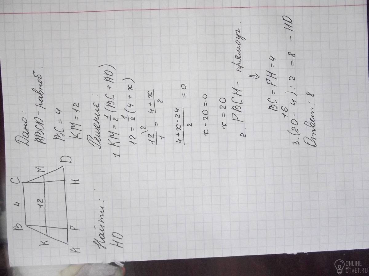 средняя линия KM трапеции равна 12, а меньшее