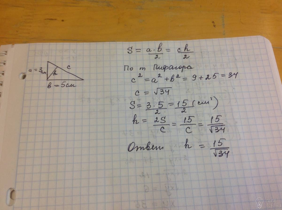Найдите высоту, опущенную на гипотенузу прямоугольного треугольника, если его катеты равны 3 см и 5 см.