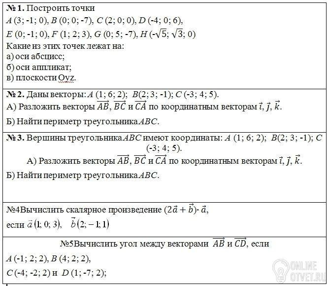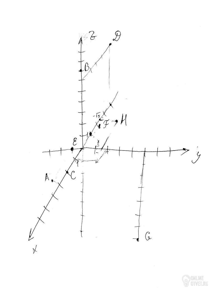 в) На плоскости ОХУZ лежат только точки. у которых абсцисса равна 0. Это значит, что первая координата равна нулю. Этому условию удовлетворяют точчки B(0;0;-7), E(0;-1;0),G(0;5;-7)