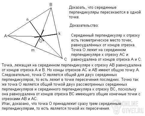 доказать что серединные перпендикуляры к сторонам треугольника пересекаются в одной точке