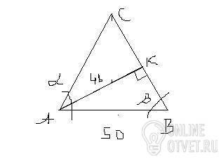 в равнобедренном треугольнике ABC с основанием АВ=50 известно, что высота, опущенная к ВС, равна 48.Найдите cosA