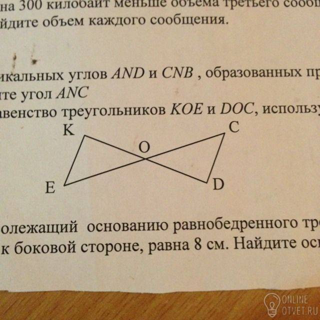 Проведем длины ЕД и КС получим параллелограмм, углы КОЕ и СОД вертикальные значит равны , в параллелограмме противоложенные стороны параллельны между собой и равны , значит ЕД=КС , КД и ЕС диагонали параллелограмма , Диагонали параллелограмма пересекаются и точкой пересечения делятся пополам, то есть КО =ОД итд , по равенству треугольников если стороны и углы между ними равные то треугольники равные