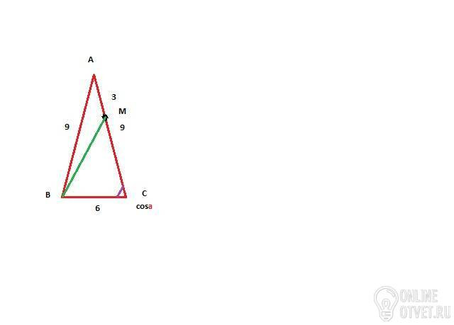 Точка М выбрана на боковой стороне АС равнобедренного треугольника АВС так, что АМ=3см. Найдите ВМ, если АВ=АС=9см, ВС=60см.