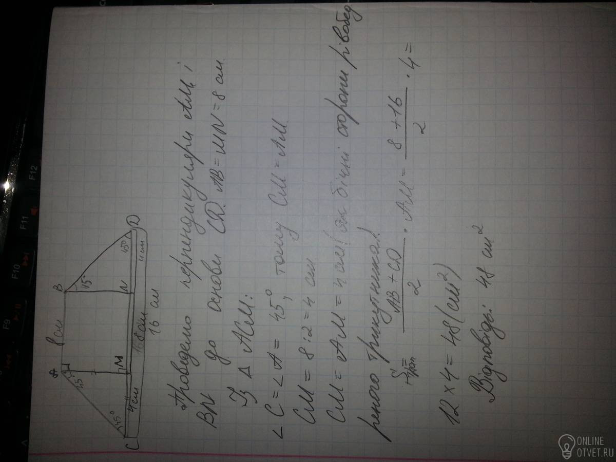 Основи рівнобічної трапеції 8 см і 16 см, а гострі кути по 45 градусів.Знайти площі трапеції