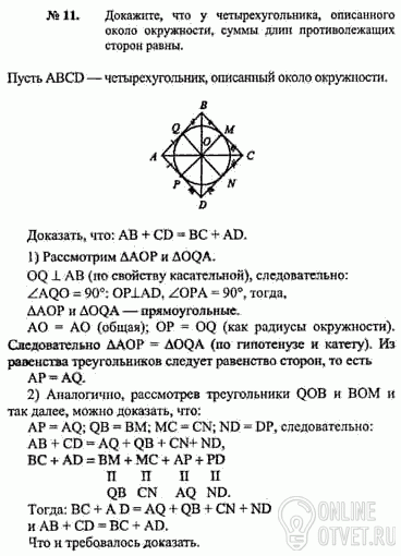 Докажите,что у четырёхугольника,описанного около окружности,суммы противолежащих сторон равны.