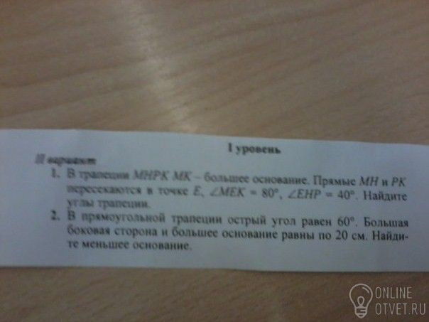 2) Опустив перпендикуляр к большему основанию трапеции из тупого угла меньшего основания, получим прямоугольный треугольник с углом в 60 градусов. Прилегающий к нему катет будет равен 20*соs60 = 20*1/2=10 см. Таким образом меньшее основание будет равно разнице между большим основанием и найденным катетом, т.е. 20-10=10 см