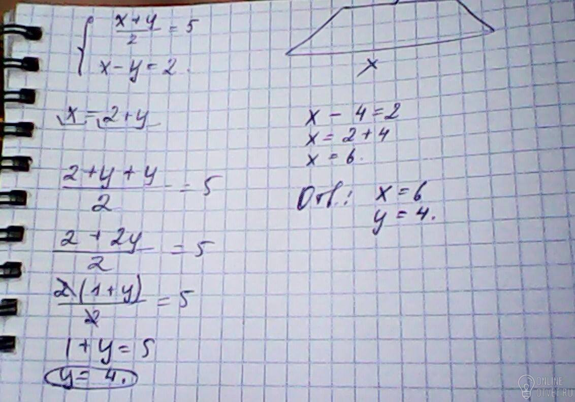Средняя линия трапеции равна пяти. Разность оснований равна двум. Найдите основания трапеции.
