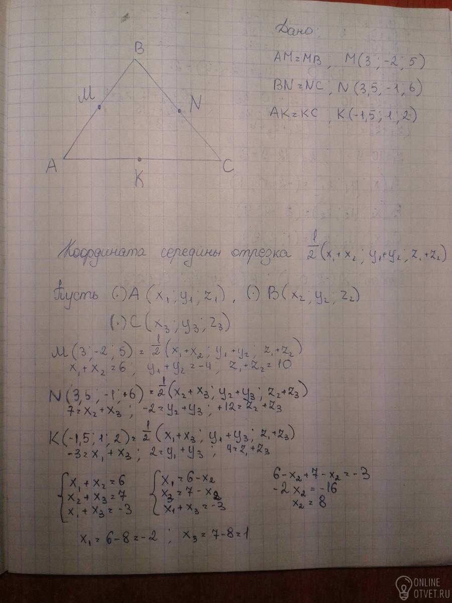 M (3; -2; 5) N (3,5; -1; 6) K (-1,5; 1; 2) Найти координаты точек A B С